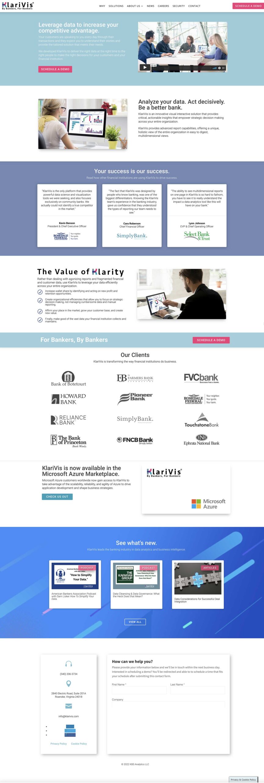 KlariVis is a FinTech SaaS product bringing detailed insight to banks. The platform compiles and aggregates high-value, actionable data into intuitive, interactive dashboards that provide financial institutions of all sizes with timely insights to empower teams, drive profitability, and improve productivity.